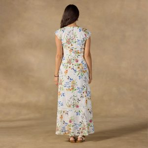 Absolutely ravishing. our sleeveless. floral print dress in luxurious silk has so many details to love. Surplice neckline with asymmetrical ruching detail. adjustable shoulder ties. deep side slit. elastic at the back for comfort and back yoke detail. Fully lined. Dry clean. Imported. Exclusive. Sizes XS (0-2). S (4-6). M (8-10). L (12-14). XL (16-18). XXL (20-22). Approx. 52.5l.