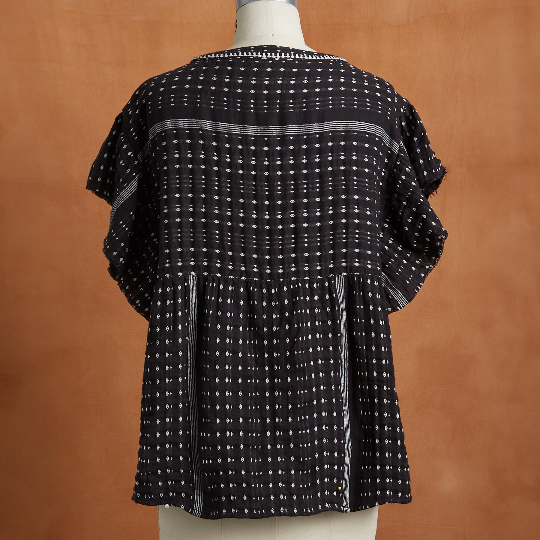 Easy and beautiful. our relaxed notch neckline top is so lovely with contrast embroidery detail on the bodice and feminine flounce with raw edge detail at the sleeves. Textured double gauze. Cotton. Machine wash. Imported. Exclusive. Sizes XS (0–2). S (4–6). M (8–10). L (12–14). XL (16–18). XXL (20–22). Approx. 25.5l.