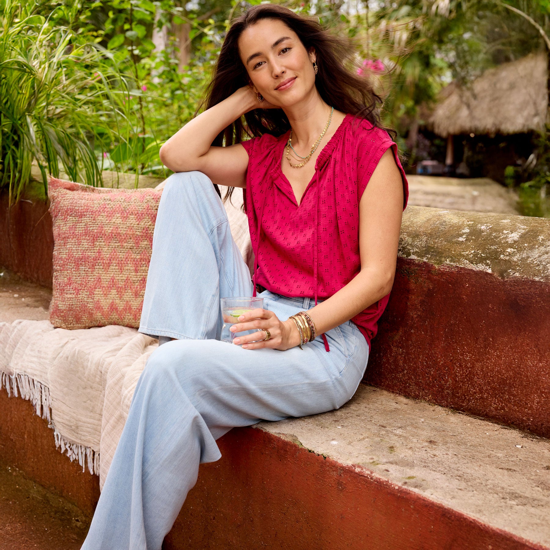 Cloud-soft knit fabric makes this sweet eyelet popover even more airy and easygoing. Notch neckline. curved hem. slash sleeve. Cotton. Machine wash. Imported. Sizes XS (0–2). S (4–6). M (8–10). L (12–14). XL (16–18). XXL (20–22). Approx. 25.25l.