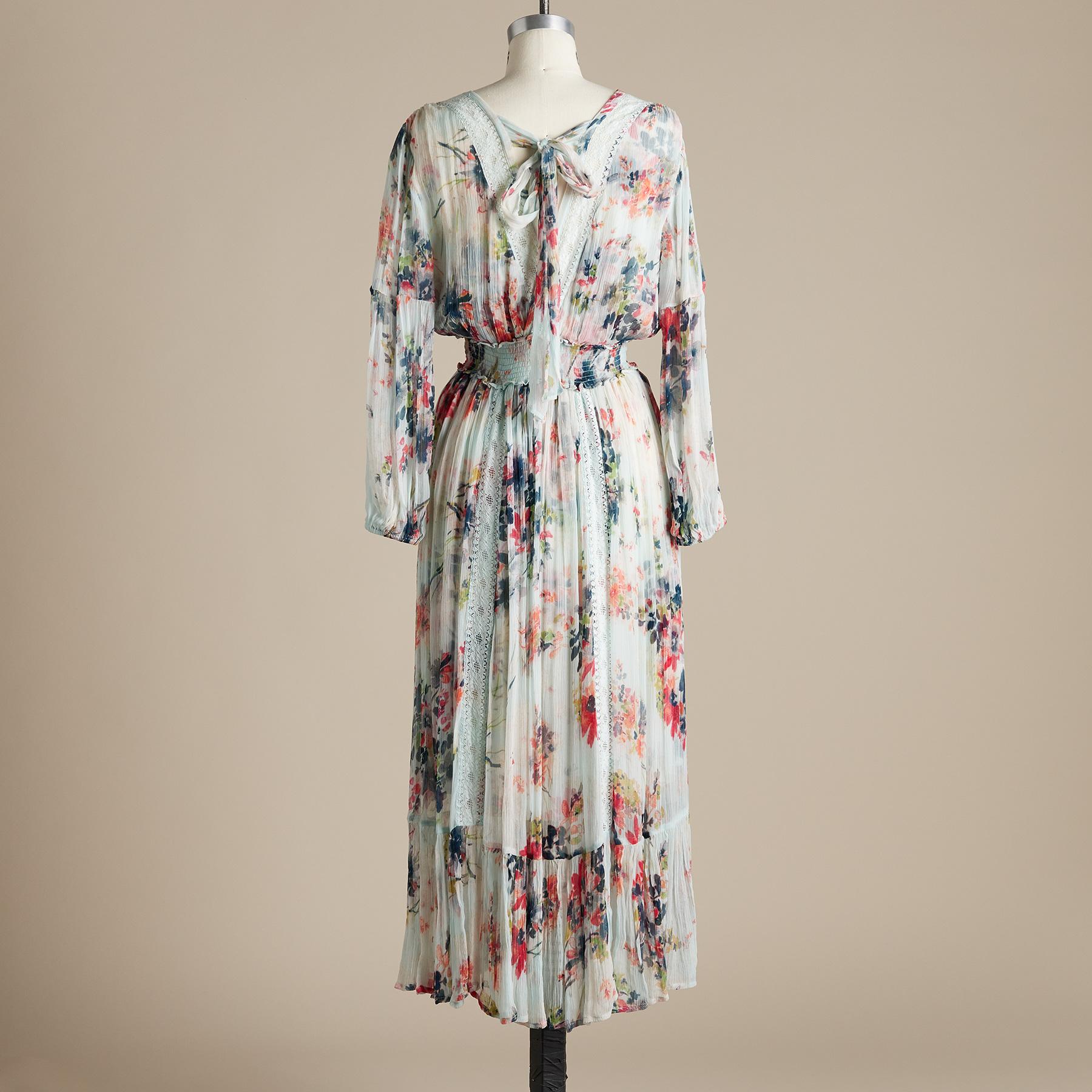 The picture of romance. in crinkle chiffon. with dropped V-neck and deep V-back with tie. Ruffle hem. lace trim. smocked waist and puff sleeves. Fully lined. Cupro. Hand wash. Imported. Exclusive. Sizes XXS (00). XS (0 to 2). S (4 to 6). M (8 to 10). L (12 to 14). XL (16 to 18). Approx. 47-3/4L.