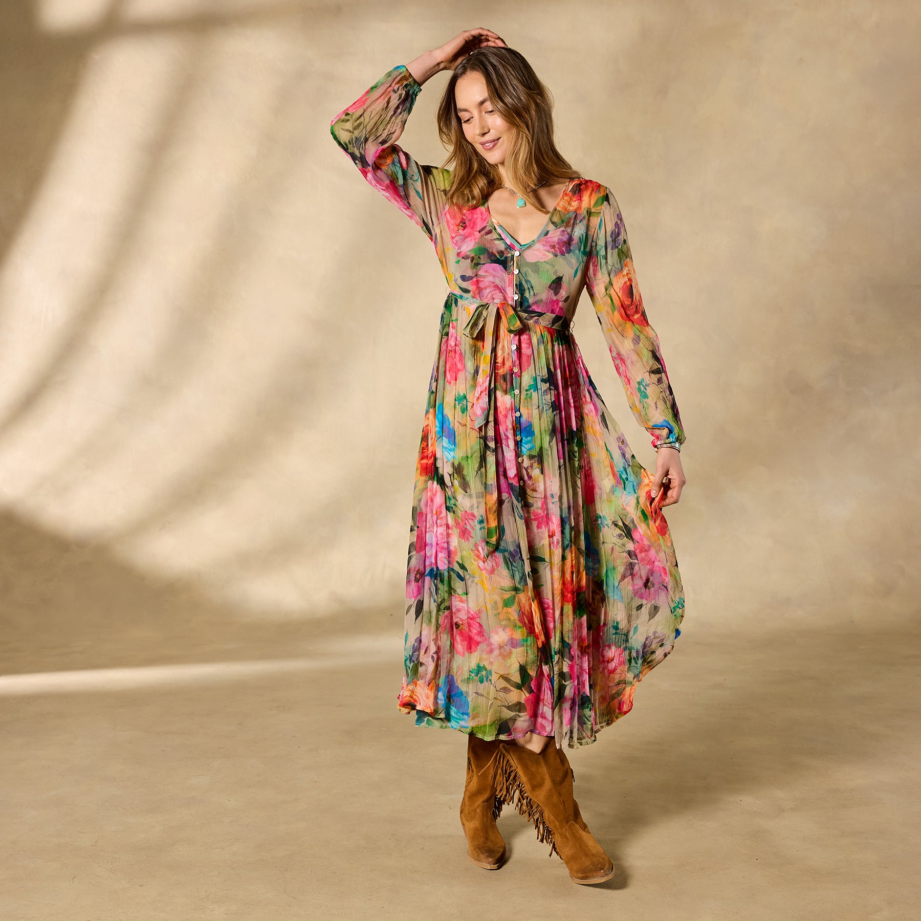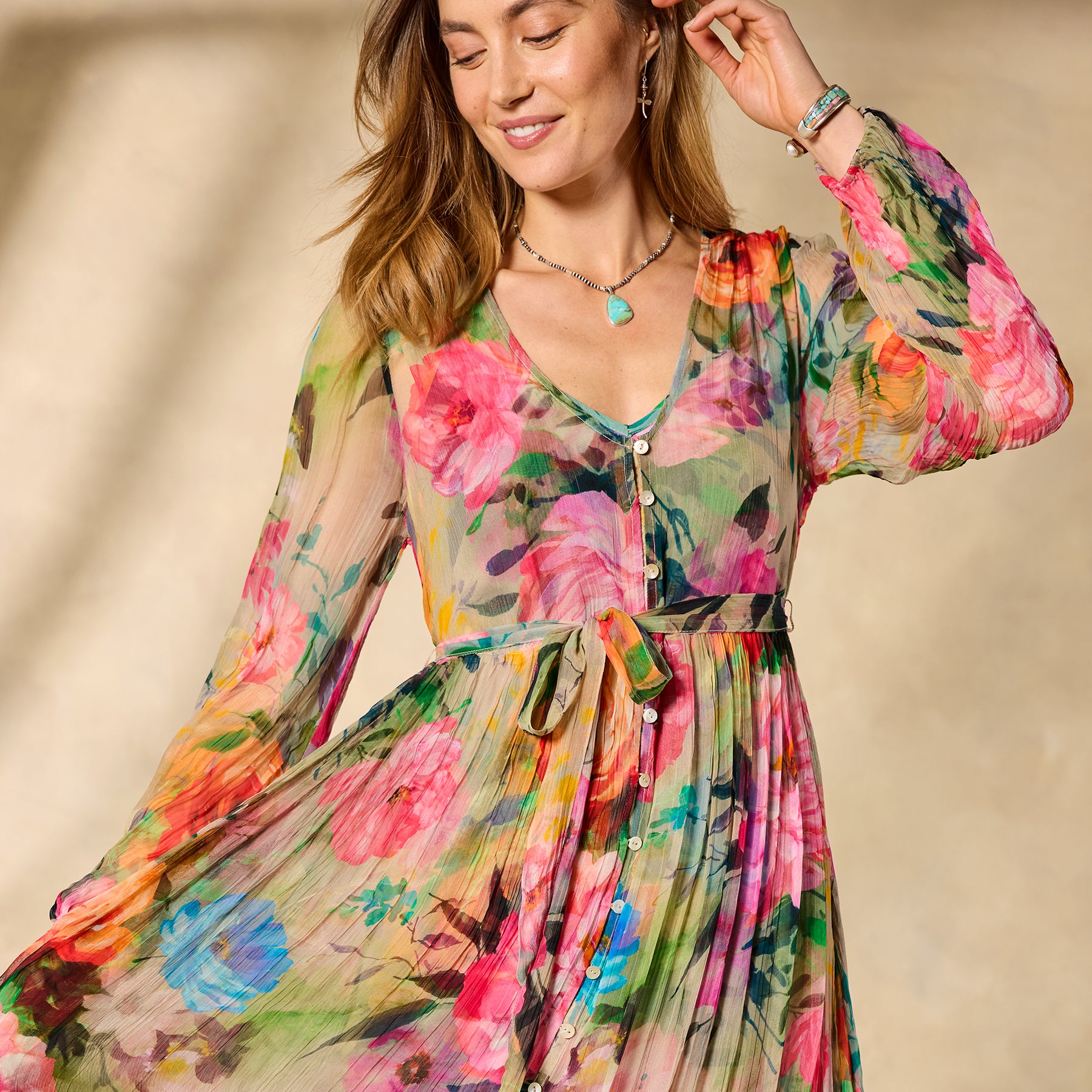 Be a heavenly vision wherever you go in our floaty Halcyon maxi. A vibrant exploded floral pattern further elevates an already stunning jacquard fabric; with shell buttons. elastic cuffs. removable belt and separate printed slip. Viscose. Machine wash. Imported. Exclusive. Sizes XXS (00). XS (0–2). S (4–6). M (8–10). L (12–14). XL (16–18). Approx. 49l.