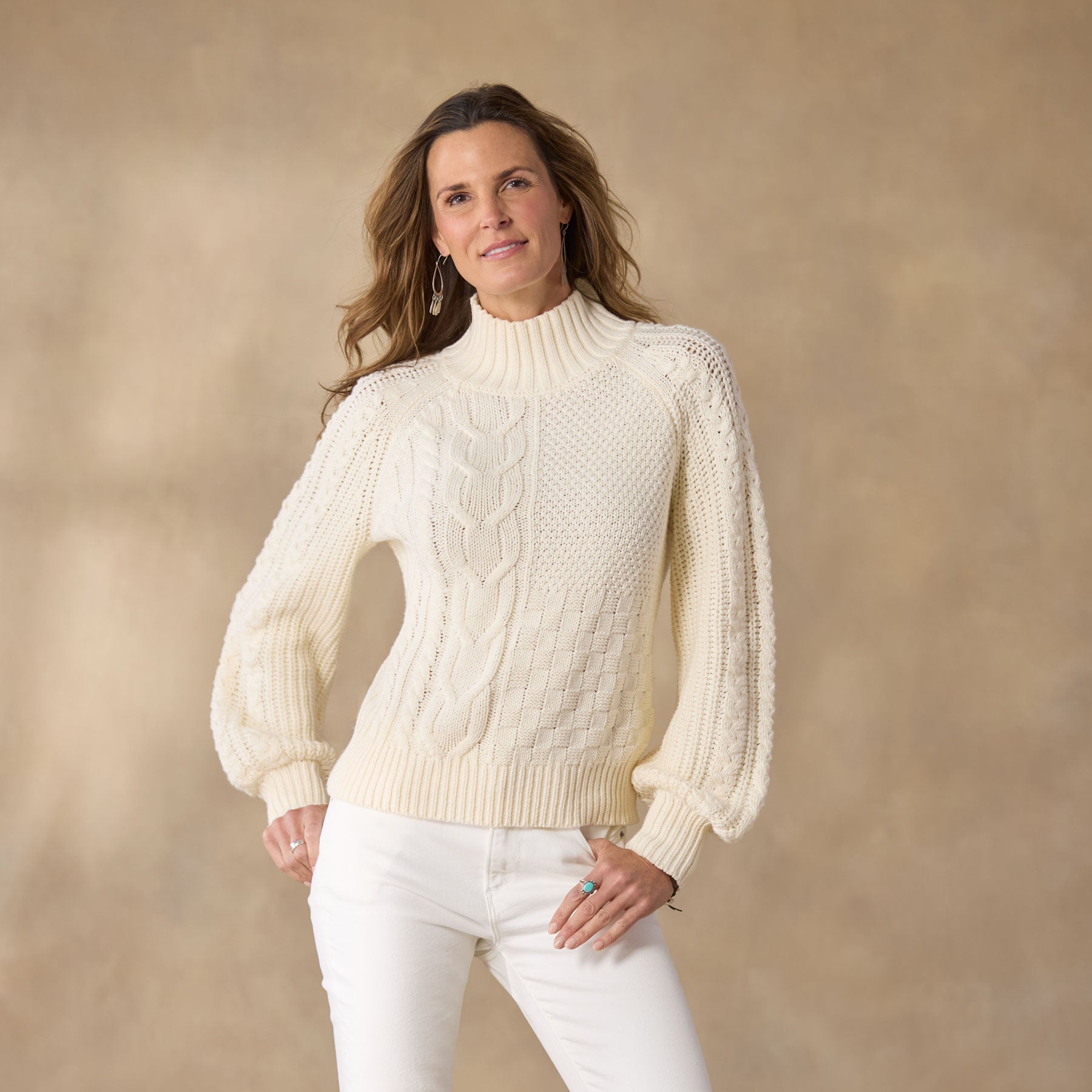 A celebration of texture. our patchwork-inspired mixed stitch pullover pleases so with a tonal marled look. mock turtleneck. rib trim and subtle volume sleeves. A great everyday staple. Hand wash. Imported. Exclusive. Sizes XXS (00). XS (0??). S (4??). M (8??0). L (12??4). XL (16??8). Approx. 21l.