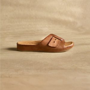 Go in comfort and style in these vegetable-tanned leather sandals with unique slip-through design straps and metal stud accents. Cork or rubber socks. rubber soles. Handcrafted. Imported. Whole sizes 6?C11. 1 heel.