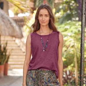 Our cotton slub muscle tank has the cleanest silhouette. with exposed stitching and raw-edge details. Slight hi-lo hem. Machine wash. Imported. Exclusive. Sizes XS (0??). S (4??). M (8??0). L (12??4). XL (16??8). XXL (20??2). Approx. 25l.
