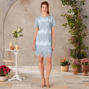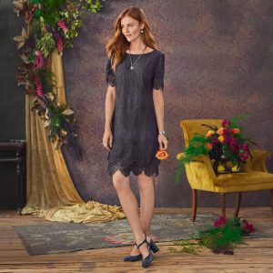 Embroidered lace shift dress with alluring deep back V with zipper. scalloped sleeves and hem. Fully lined. Nylon. Hand wash. Imported. Exclusive. Sizes XS (0-2). S (4-6). M (8-10). L (12-14). XL (16-18). XXL (20-22). Approx. 38l.