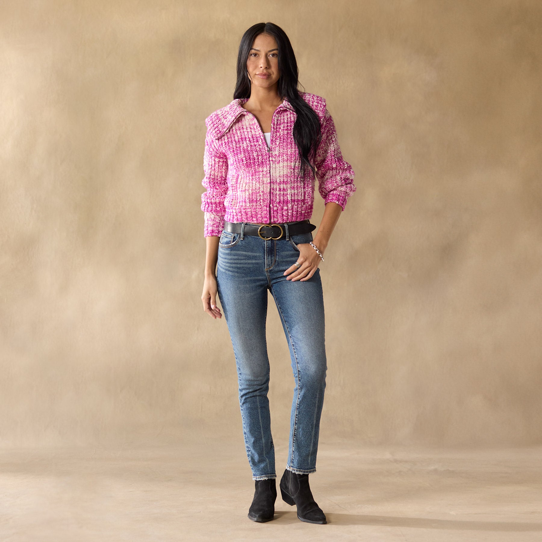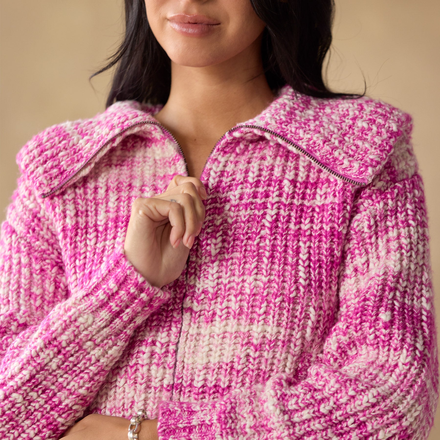 Our chunky. space-dyed slub cardigan keeps you warm and chic. with rib body. zip front. leather zipper pull. a generous. zip-through collar and feminine volume sleeves. Lots of texture and style. with transfer and pointelle details. welt pockets and rib trim. Acrylic/merino wool/pafafil. Hand wash. Imported. Exclusive. Sizes XS (0–2). S (4–6). M (8–10). L (12–14). XL (16–18). XXL (20–22). Approx. 19l.